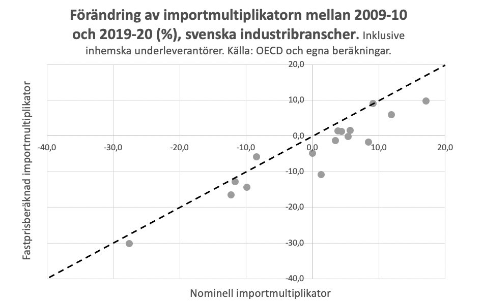 Trots att mönstret efter finanskrisen är likartat för den svenska importmultiplikatorn i löpande och fasta priser, framgår det av diagrammet nedan att det är väsentligt fler branscher inom industrin som ökar sin importanvändning i termer av löpande än av fasta priser. Vi ser också att så gott som alla branscher ligger under den streckade linjen. Det betyder att förändringen av importmultiplikatorn mellan 2009-10 och 2019-20 är större i termer av löpande än av fasta priser.