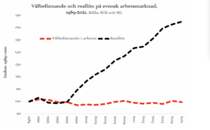 Anlägger vi i stället ett historiskt perspektiv ser vi av diagrammet att välbefinnandet i arbetet på svensk arbetsmarknad har varit oförändrat de senaste 30 åren. Och detta trots att reallönerna har ökat snabbt sedan den andra halvan av 1990-talet – men i spåren av pågående inflationskris under ett antal år kommer att ligga lägre än tidigare.