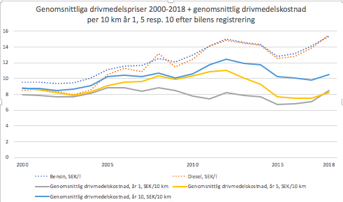 Samtidigt har dock nya bilar efterhand blivit betydligt mera bränslesnåla. Så trots att priserna på bensin och diesel har stigit betydligt var drivmedelskostnaden för att köra 10 kilometer 2018 för nya, respektive 5 år gamla bilar nominellt ungefär den samma som 18 år tidigare – detta trots en inflation på 26 procent!