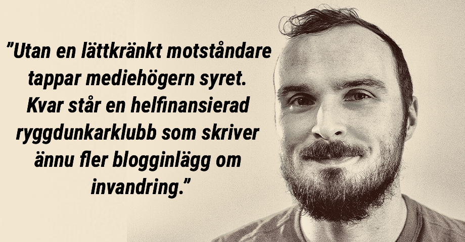 Mediehögerns genväg till uppmärksamhet stavades länge försök kränka och uppröra vänsterpersoner som i sin tur delar vidare och beskriver ditt alster och innehåll med starka ord. Men nu har samma elitprojekt och artiklar funnits i flera år, få blir idag upprörda av samma gamla slentrianmässig känslosås från högern och vänsterpubliken i sociala medier följer inte med till alla nya kanaler och sidor. I den värsta samhällskrisen sedan andra världskriget står högermedia med tillhörande tangentbordskrigare utan lösningar för hur livet ska bli bättre för vanligt folk, mer än att svenskar borde sälla sig till en upplevd nationell horisontell gemenskap som struntar i makt och inflytande. Utan en motståndare att kränka uteblir syret och den ideologiska vinsten. Kvar står en till helfinansierad ryggdunkarklubb som skriver fler blogginlägg om invandring.