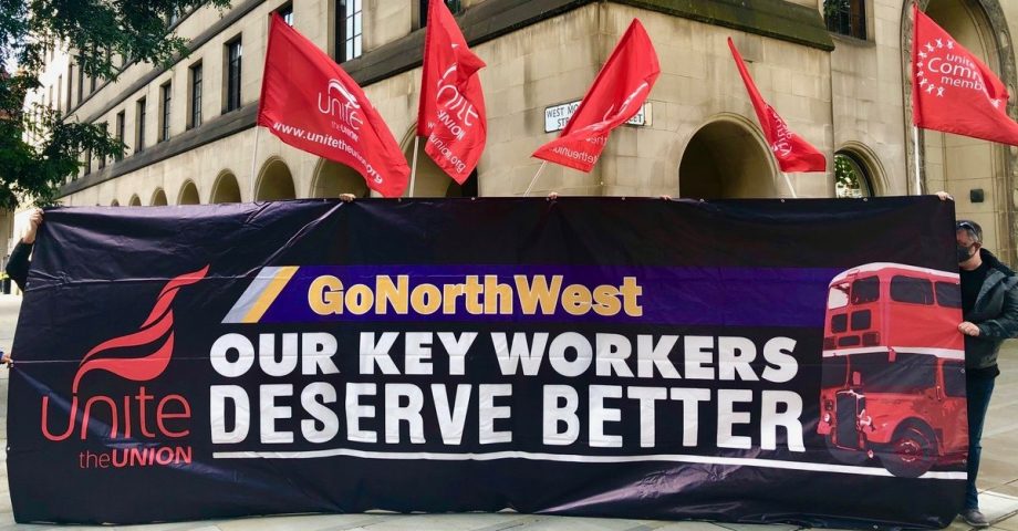 Det brittiska fackförbundet Unite demonstrerar mot ett av Go-Aheads dotterbolag. (Bild: Unite)