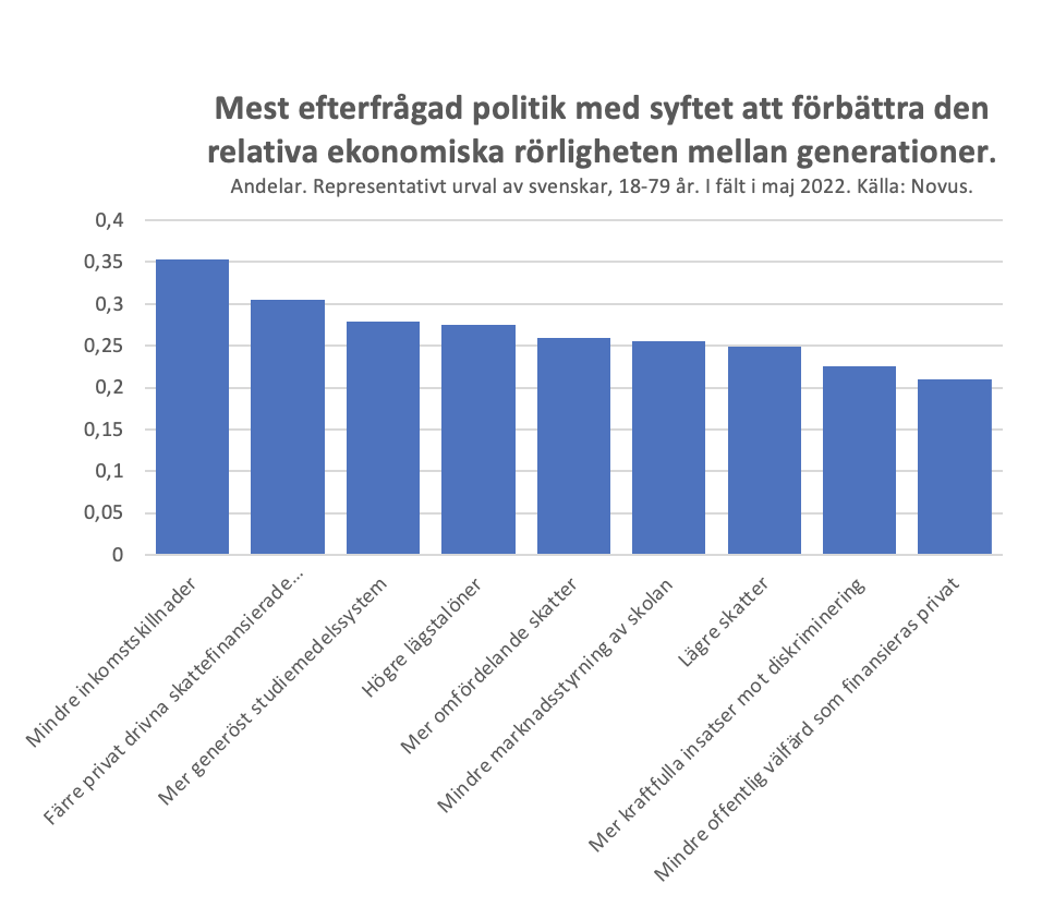 Det finns få skäl till att tro att den svenska relativa ekonomiska rörligheten mellan generationer inte kan förbättras i riktning mot den danska. Inte heller finns det skäl att oroa sig för att den danska rörligheten är ett resultat av otillständiga och omoraliska intrång i familjens inre liv. Utifrån den politiska karta som Världsekonomiskt Forum och OECD har mejslat fram, ingår det därför i Novus-enkäten en fråga om vilka politiska reformer som respondenterna föredrar om syftet är att förbättra den ekonomiska rörligheten. Frågan är konstruerad på ett sådant sätt att tio reformer ställs mot varandra och där varje reform uttrycks som ett motsatsförhållande, till exempel i form av större eller mindre inkomstskillnader och högre eller lägre lägstalöner.