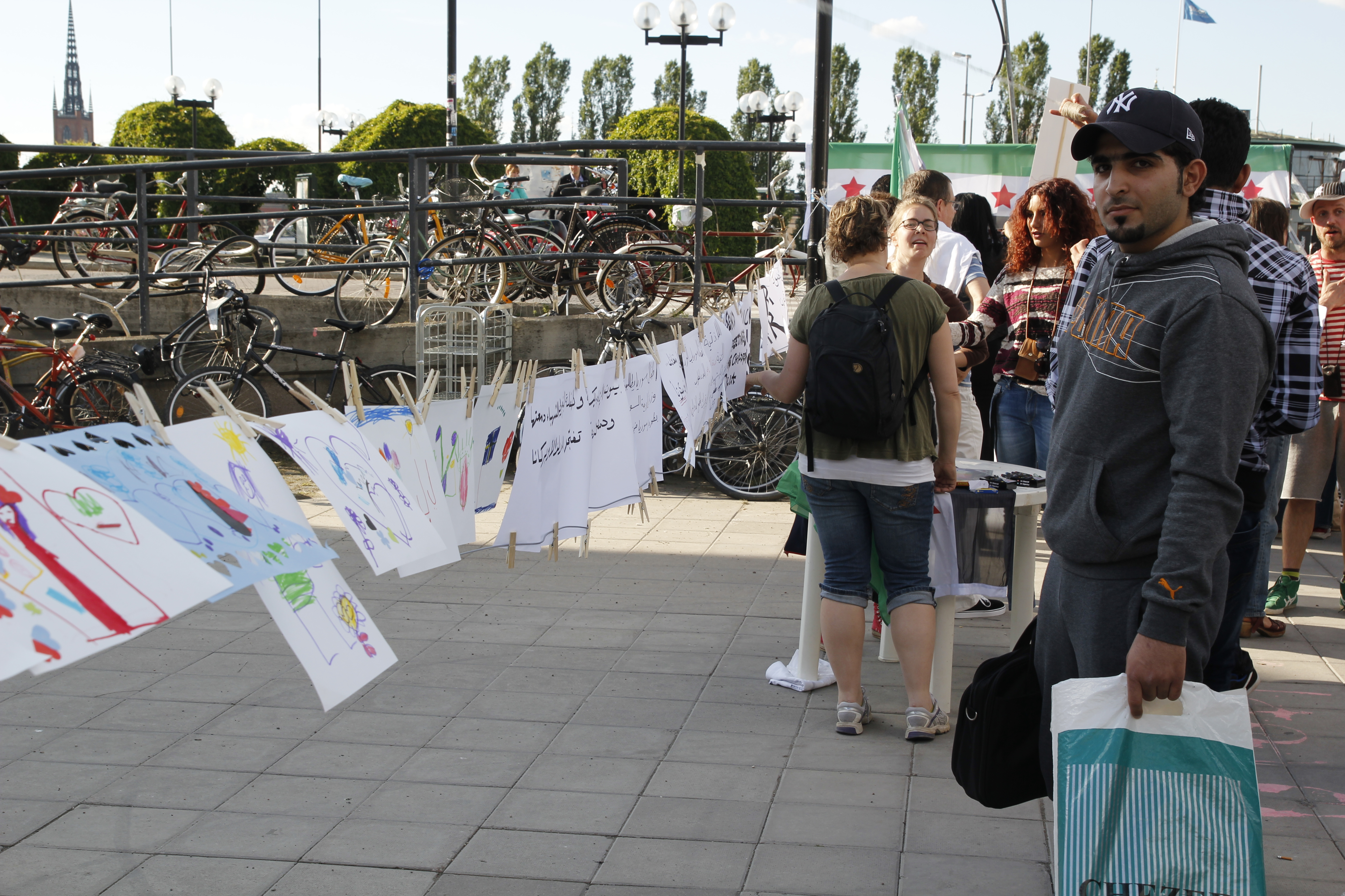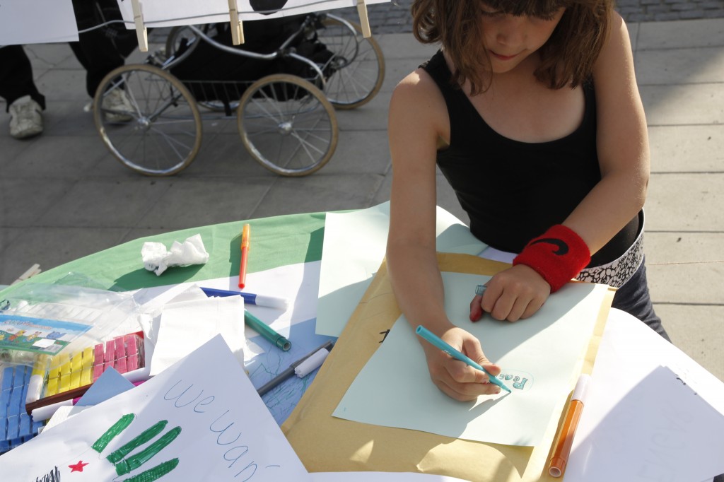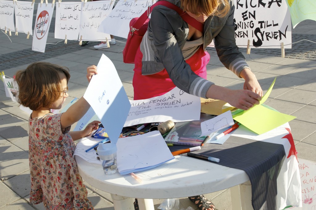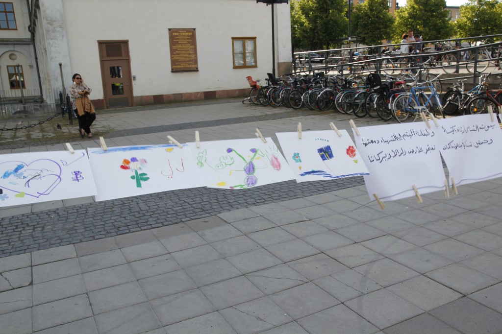 Besökarna uppmanades att ta med sig barnskor. Dessa ställdes ut för att symbolisera alla barn som mördats av regimen sedan revolten inleddes för 15 månader sedan. Barn och vuxna ritade teckningar och skrev hälsningar till barnen i Syrien. Dessa kommer att samlas på en blogg och förmedlas vidare till barnen i Syrien. Manifestationen arrangerades av frivilliga personer och var politiskt obunden.