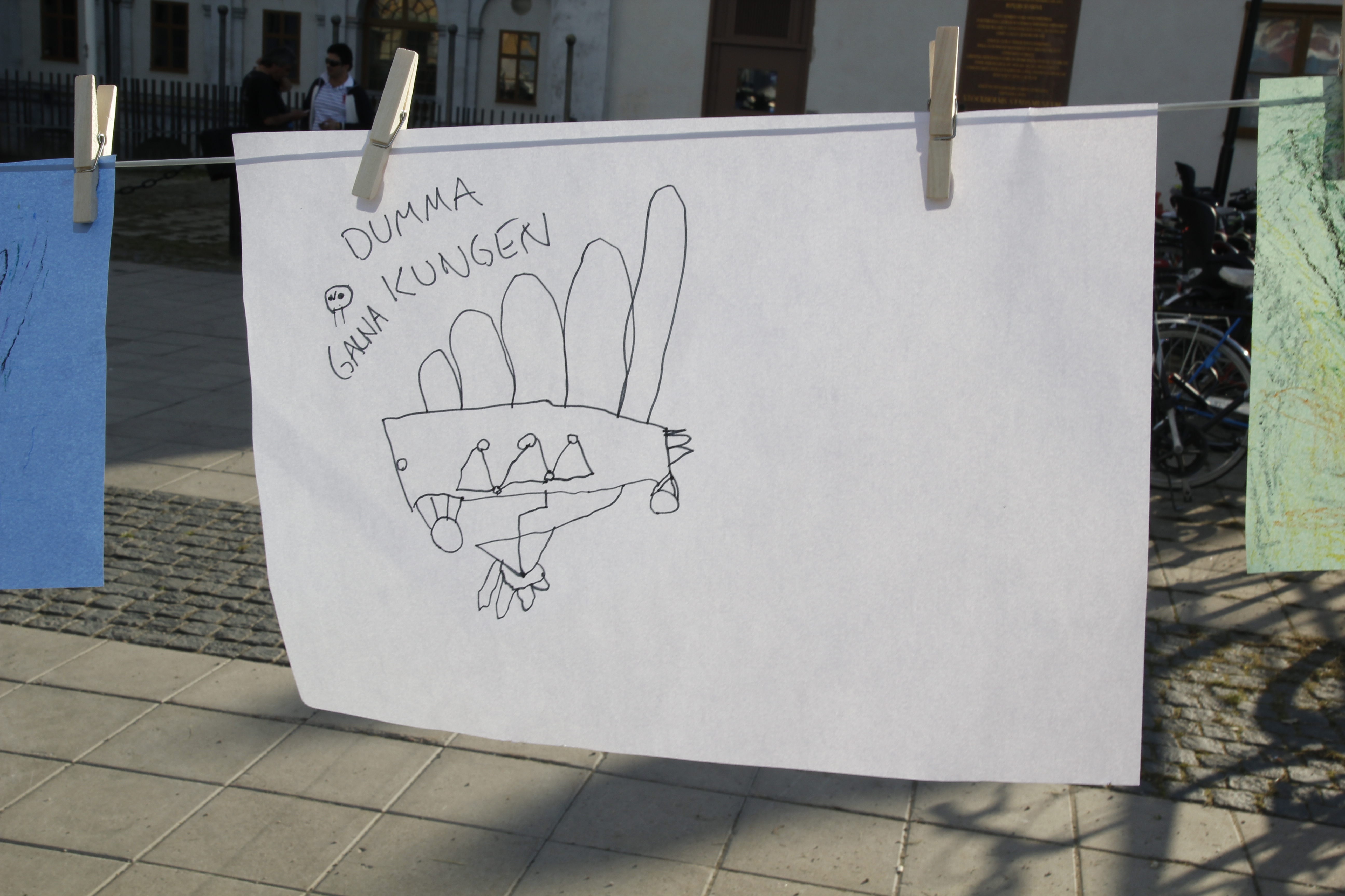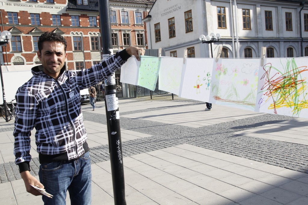 Här står Riyad och sätter upp teckningar.