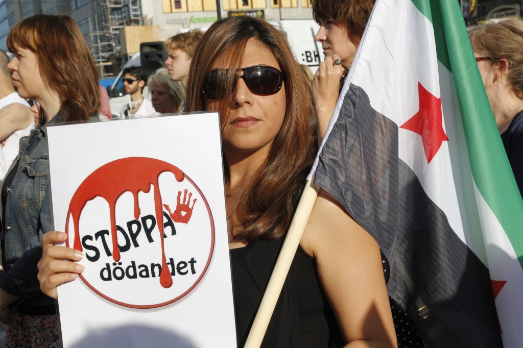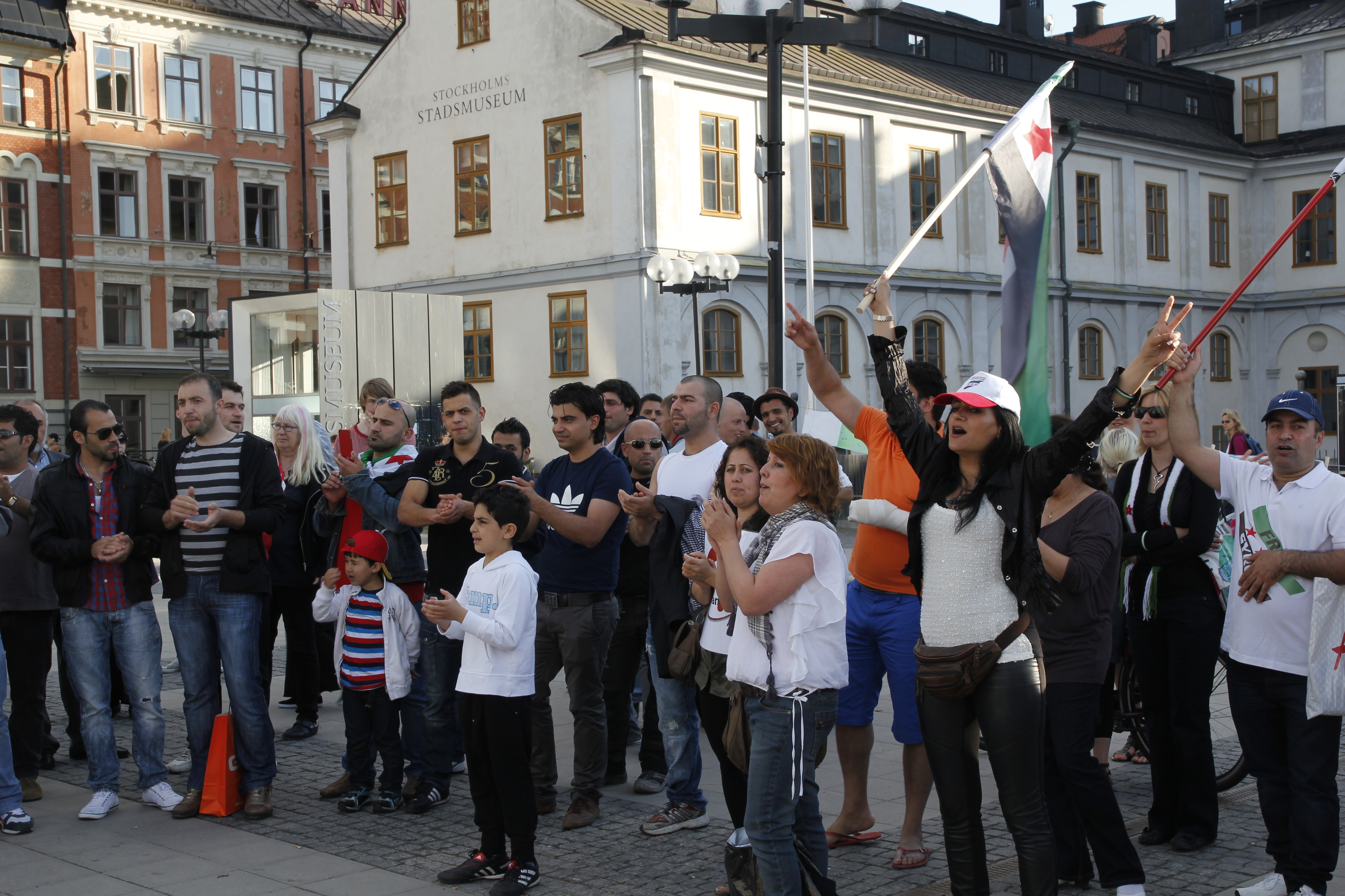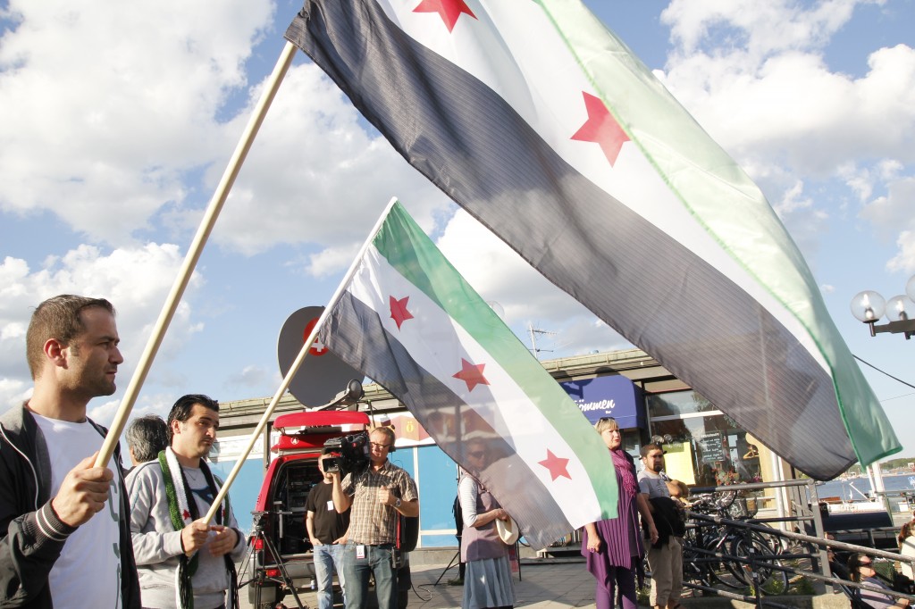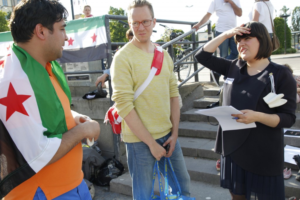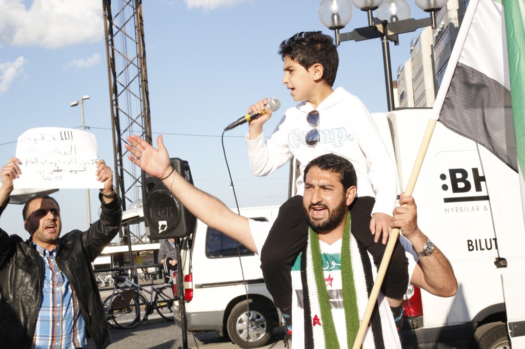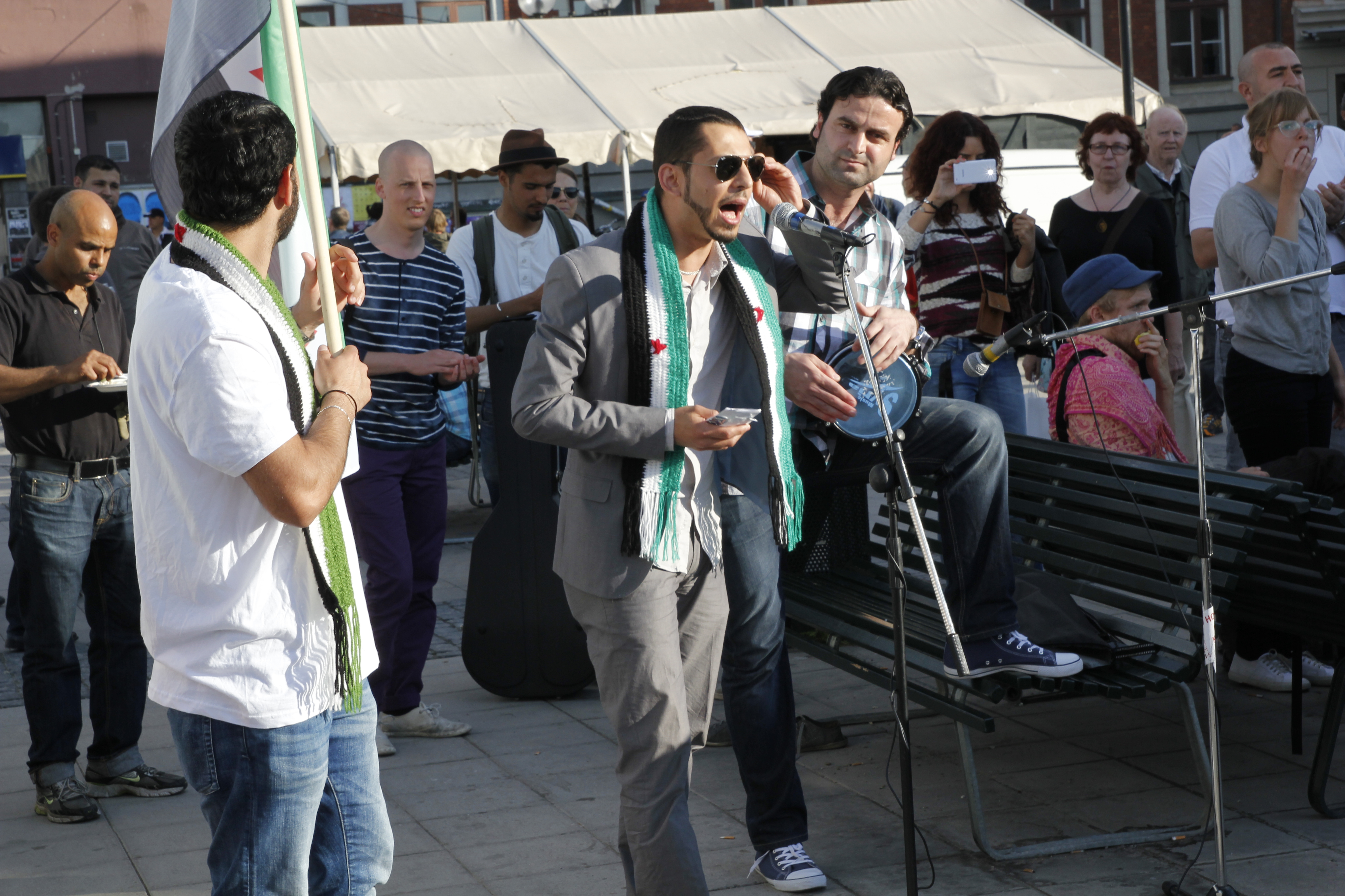 Syriska oppositionella aktivister, som vill vara anonyma, sjöng och spelade table under manifestationen.