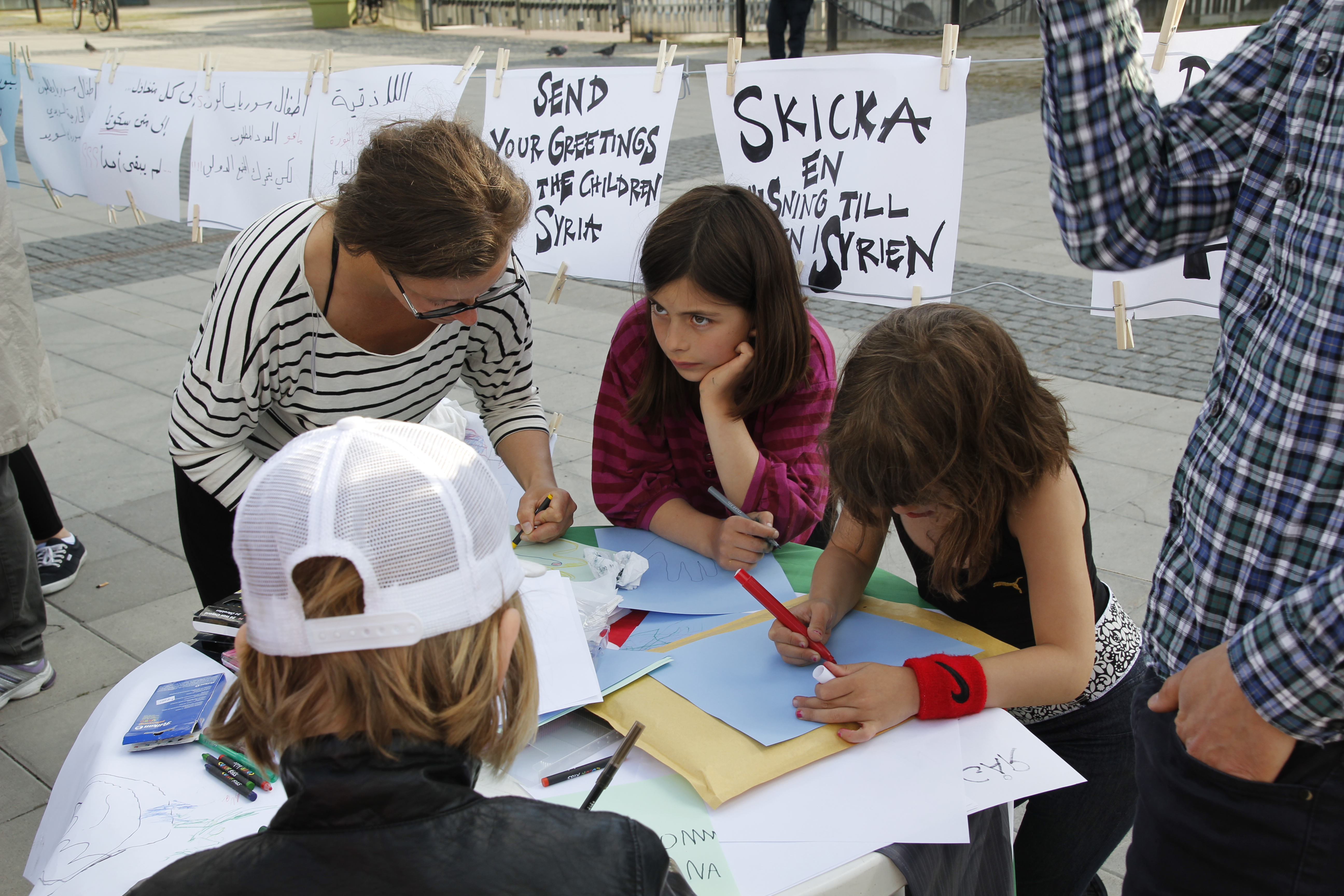 På plats tecknade barn hälsningar för att visa sitt stöd för barnen i Syrien.