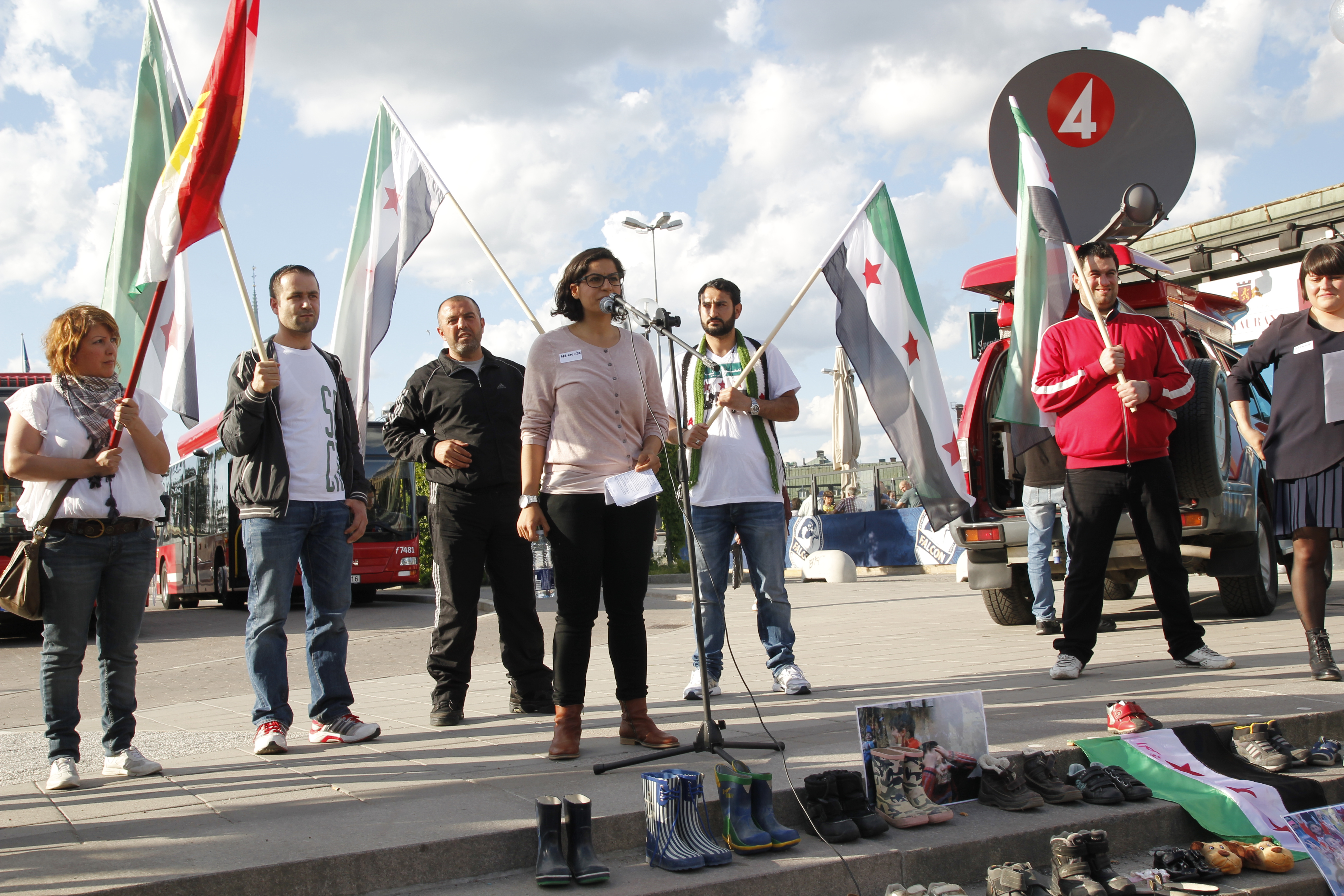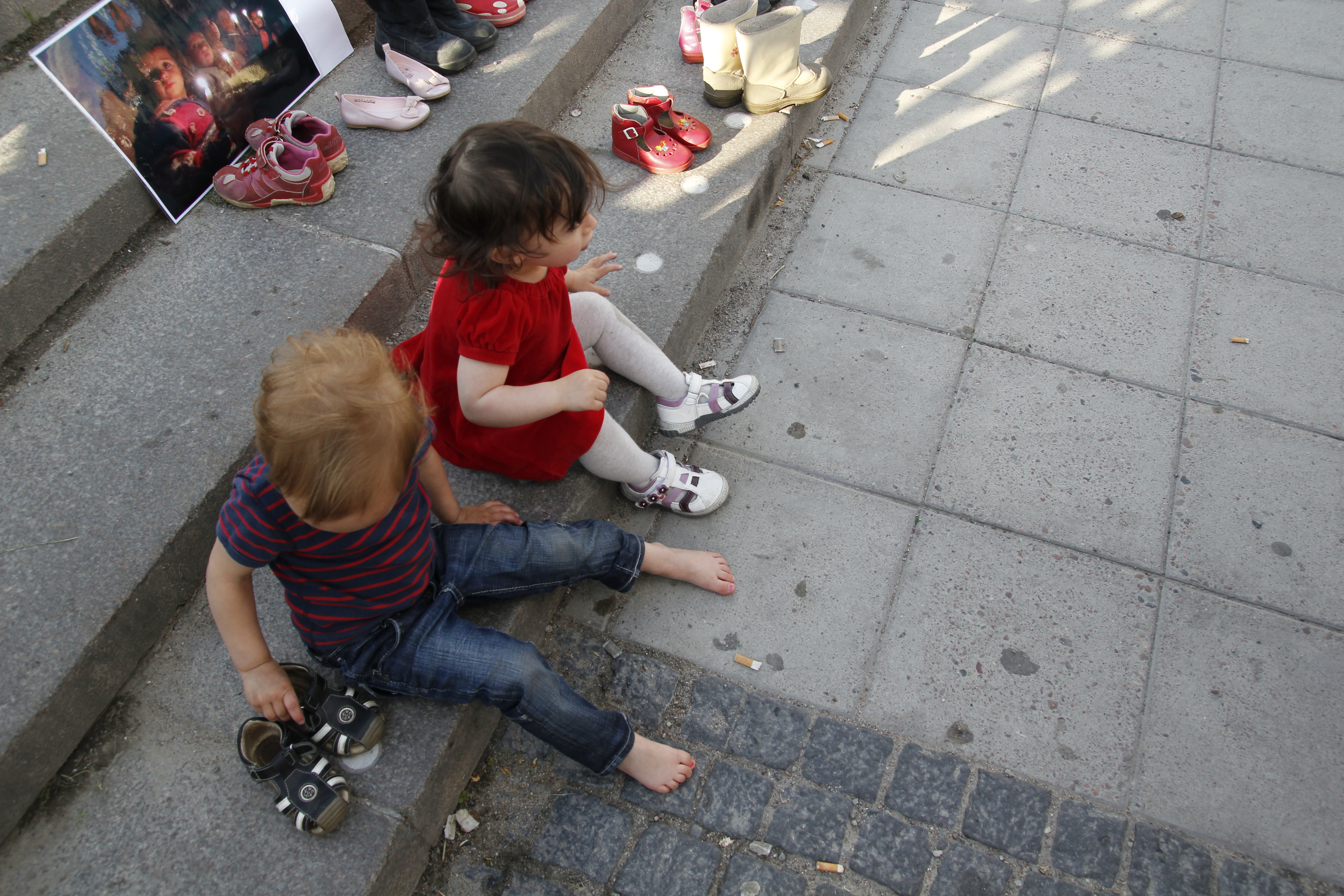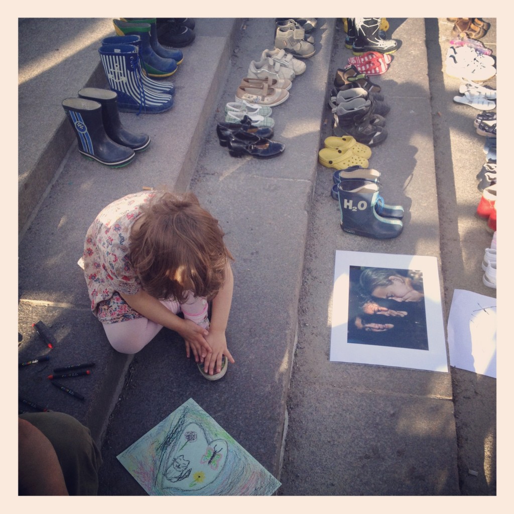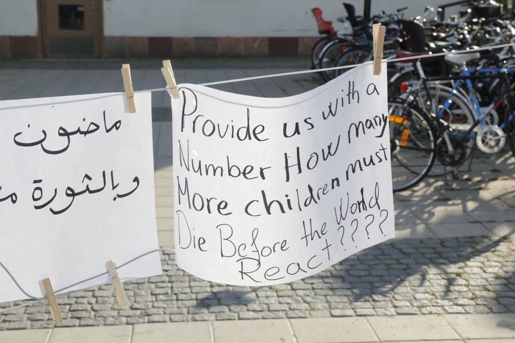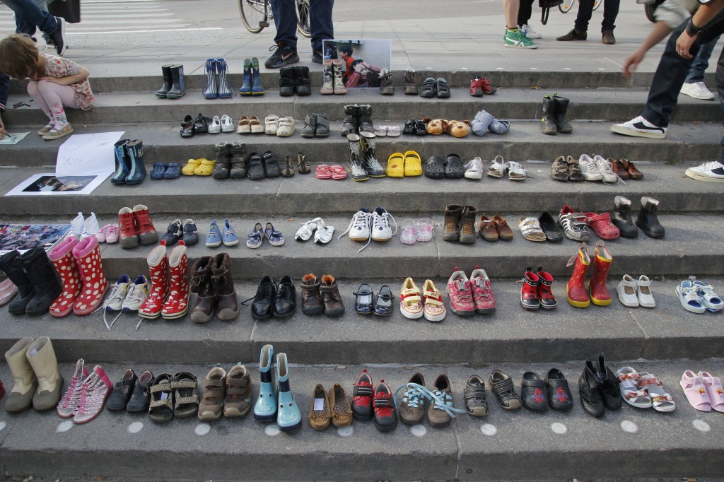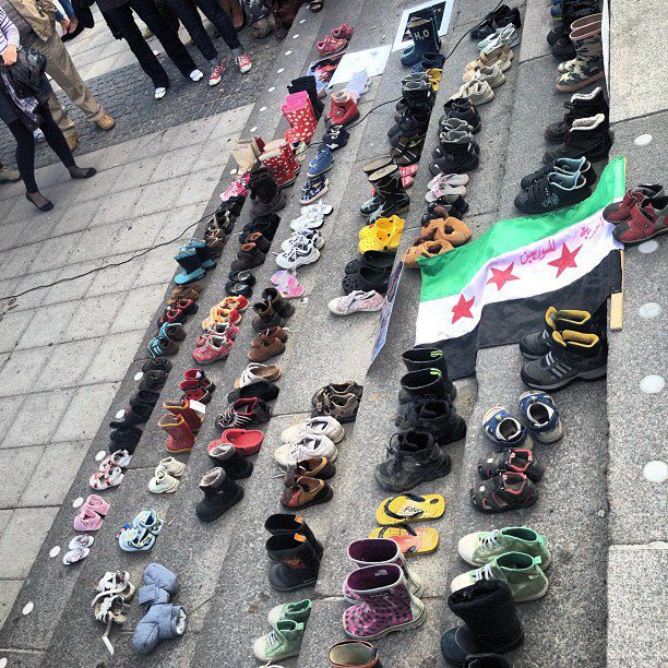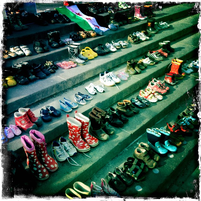 Människorättsgrupper rapporterar om att fler än 1200 barn har dödats i Syrien under ett år. Besökarna hade med sig barnskor för att illustrera hur många barn som mist livet. Bakom varje sko finns ett liv.