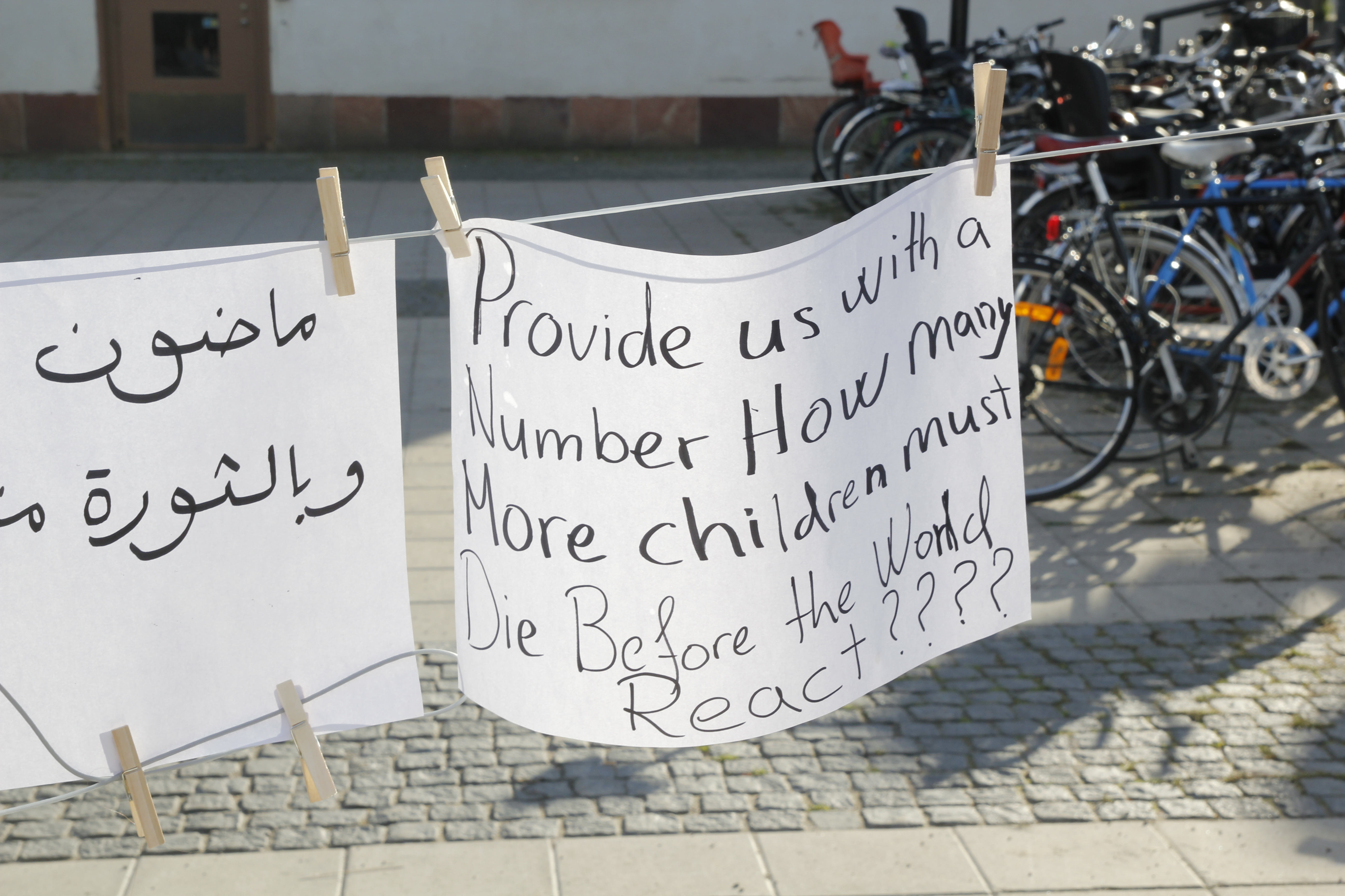 ”Vi skulle behöva vara tysta i ett dygn om varje mördat barn skulle få en egen tyst minut”, sa arrangören Somar Al Naher.