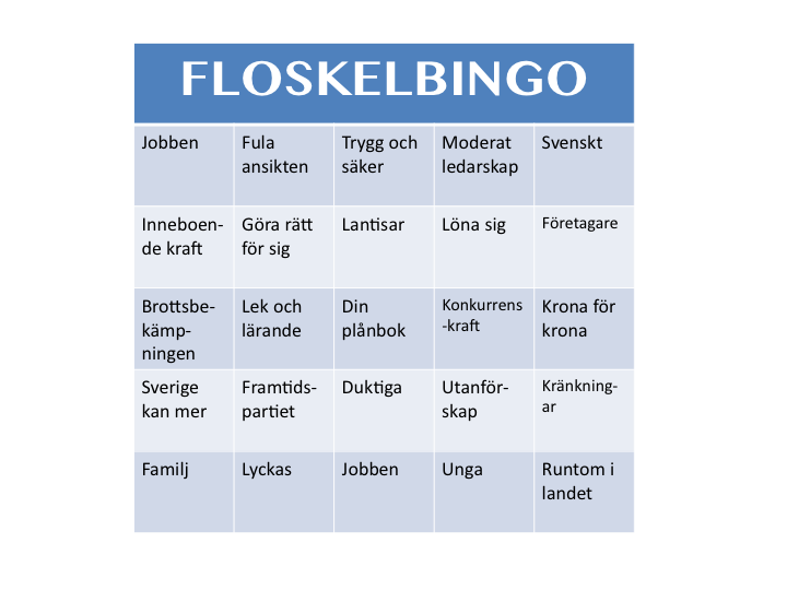 Spela floskelbingo med Dagens Arena. Varje dag publicerar vi ett floskelbingo för vad partiledarna garanterat kommer att säga. I dag är det Moderaternas tur.