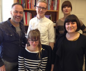 Bild: Daniel Mathisen (i vit skjorta) hälsar på Dagens Arenas nyhetsredaktion; Eric Sundström, Yonna Waltersson, Maria Georgieva och Maria Carlsson (sittande).
