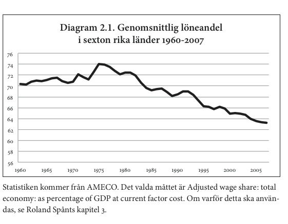 ”Ekonomin växer inte som den ska. Kapitalet klarar sig bra genom att ta en allt större del av kakan. Förlorarna är de som arbetar. De senaste årens utveckling visar på att frågan om löneandelen åter är aktuell. Som jag sa tidigare, diskussionen har bara börjat. Men det är en debatt vi måste ta. Innan rövarbaronerna och industrirobotarna har förvandlat vårt samhälle till något vi inte som vi inte känner igen och inte vill ha.”