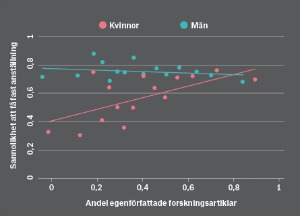 Figuren visar hur utsikten att få fast anställning för forskare i nationalekonomi påverkas av andelen egenförfattade forskningsartiklar. Bland dem som har skrivit alla sin artiklar själva finns ingen könsskillnad, men bland dem som har många medförfattare har män större chans att få anställning.
