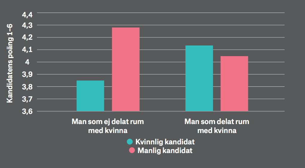 Bland de män som endast delat rum med andra män rankades den manliga kandidaten i genomsnitt som mer anställningsbar än den kvinnliga kandidaten, trots att ansökningshandlingarna var identiska utöver kön. Ingen sådan effekt återfanns hos de män som bott i könsblandade rum.