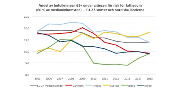 I Sverige ökar andelen pensionärer som lever under EU:s gräns för risk för fattigdom – tvärtemot utvecklingen i övriga nordiska länder.