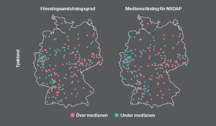 Källa: Satyanath et al. (2016) »Bowling for Fascism: Social Capital and the Rise of the Nazi Party», Journal of Political Economy, forthcoming.